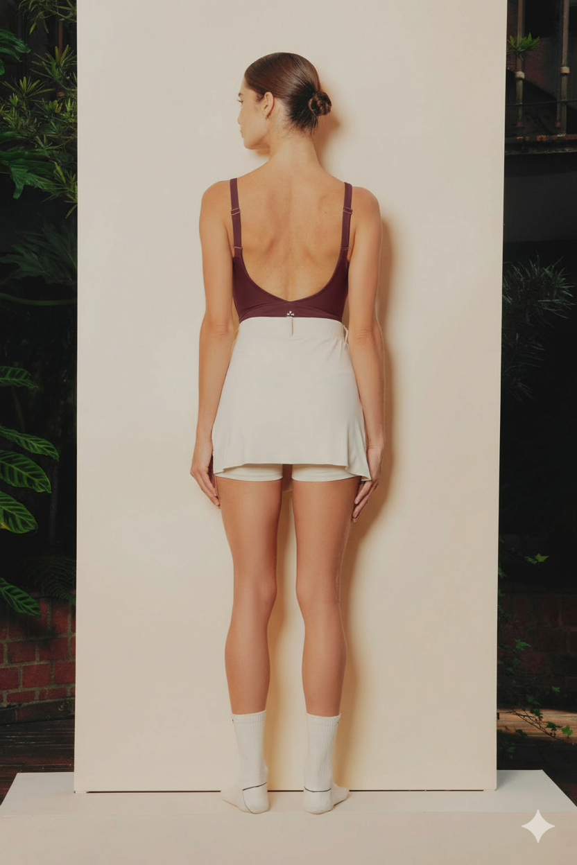 Body deportivo en color vino con sesgos en tono crudo que acentúan el torso. Escote curvo, tirantes delgados, abertura frontal y espalda abierta. Confeccionado en nylon con propiedades de elasticidad y alargamiento en ambas direcciones, de tacto suave y liso, protección UV y capacidad de compresión media.