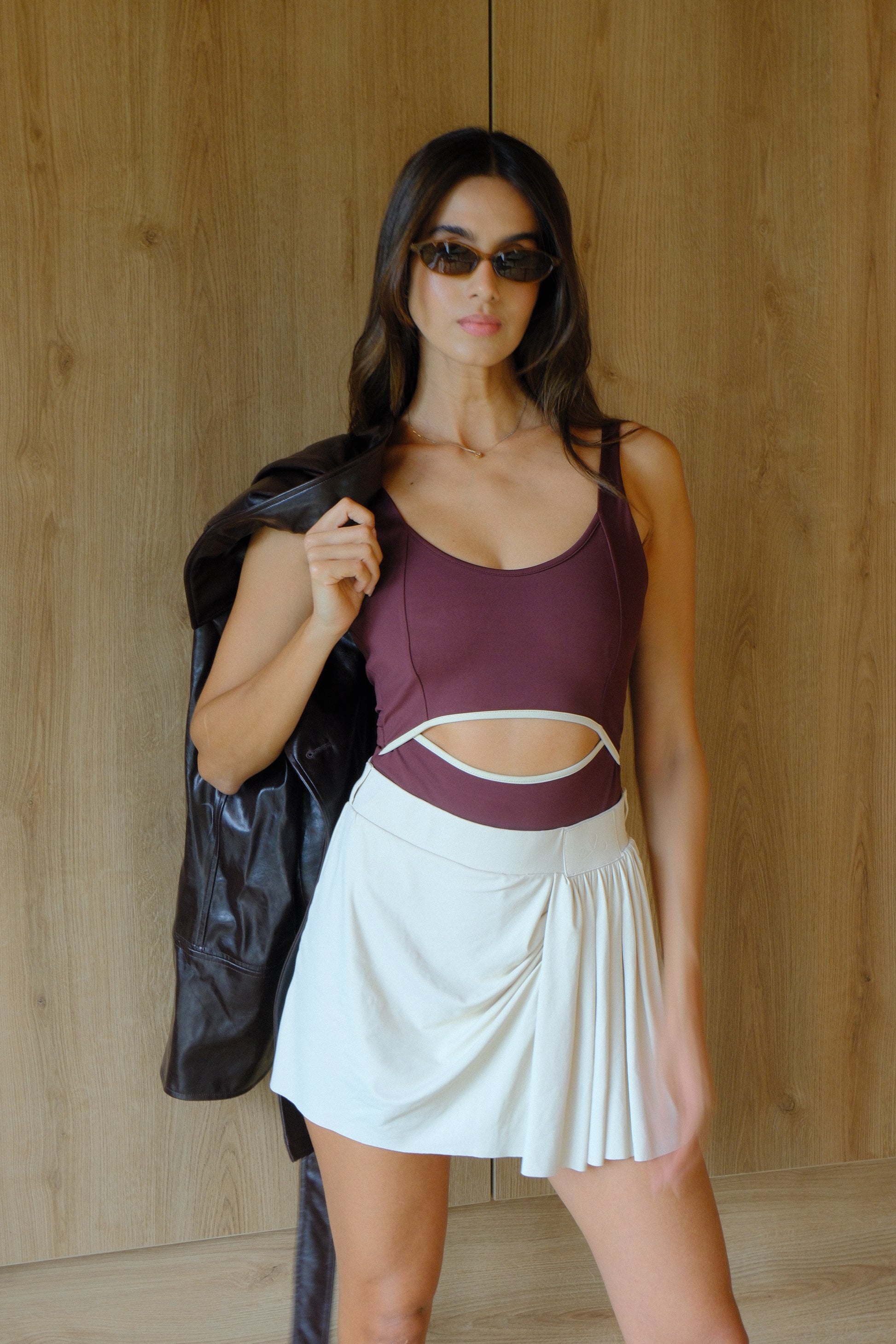 For our gassels that dress for composition: The Outlining Wine Sports Bodysuit with Off-White Cutouts.