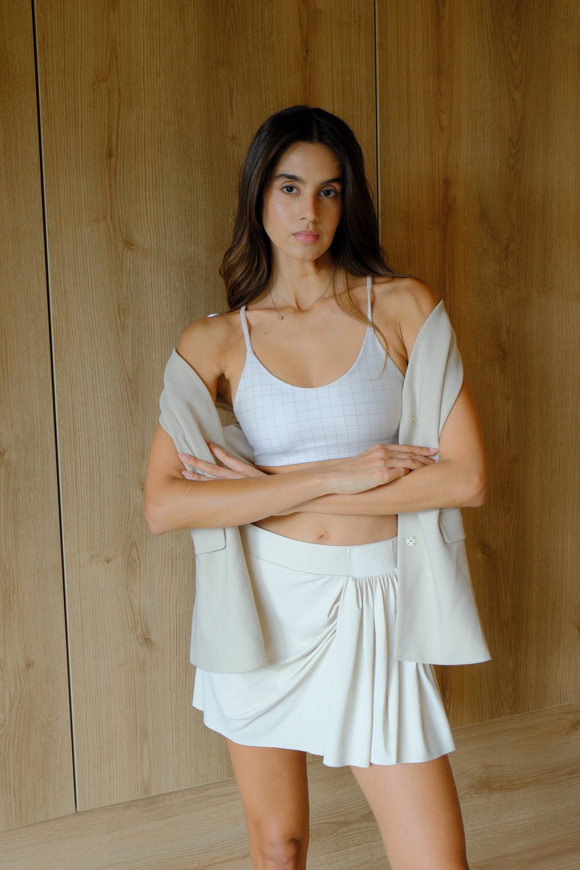 Falda deportiva en tono crudo, con drapeado frontal, pasadores y aplique en la cintura en cuero. Incluye biker interno para mayor comodidad y seguridad. confeccionada en nylon con propiedades de elasticidad y alargamiento en ambas direcciones, de tacto suave y liso, con capacidad de compresión media.